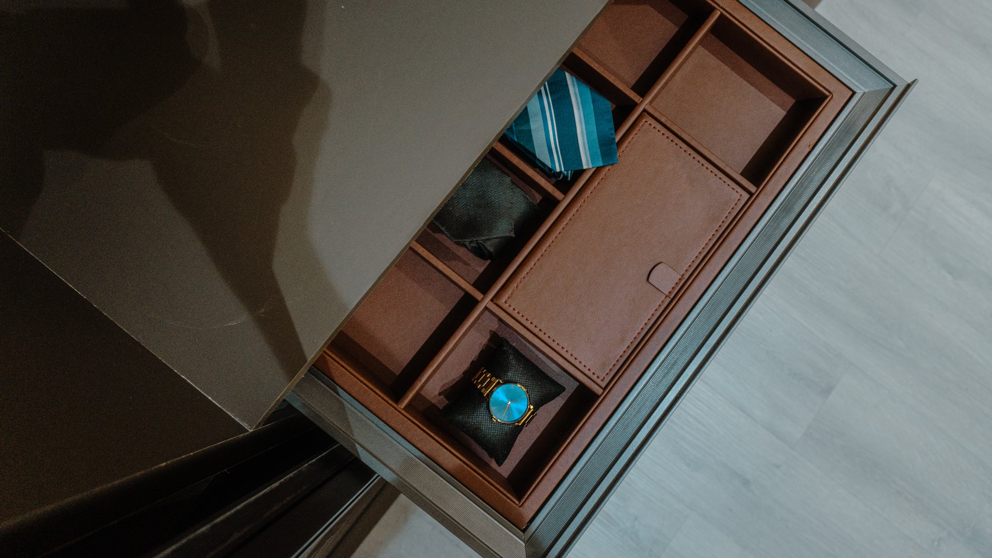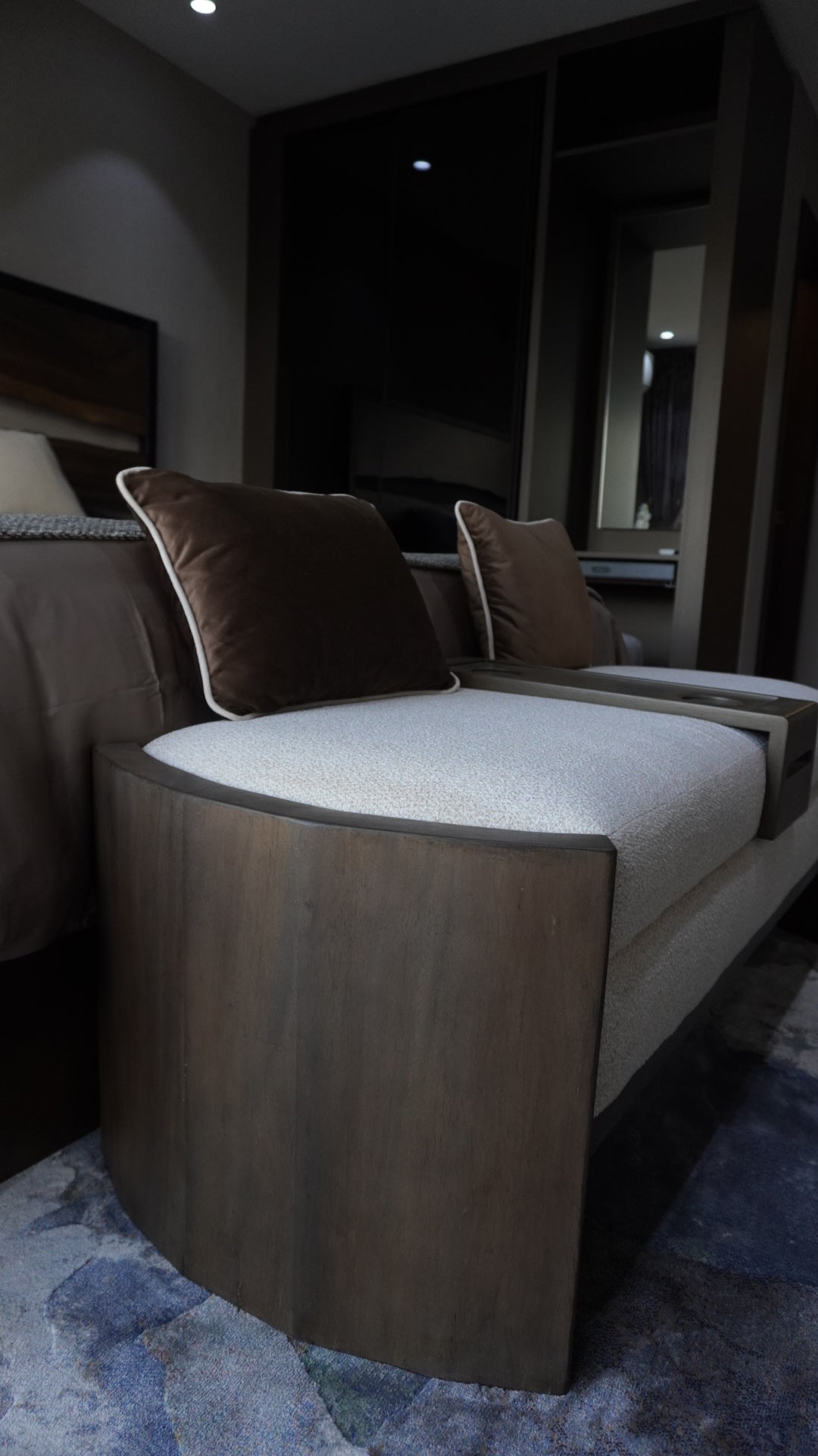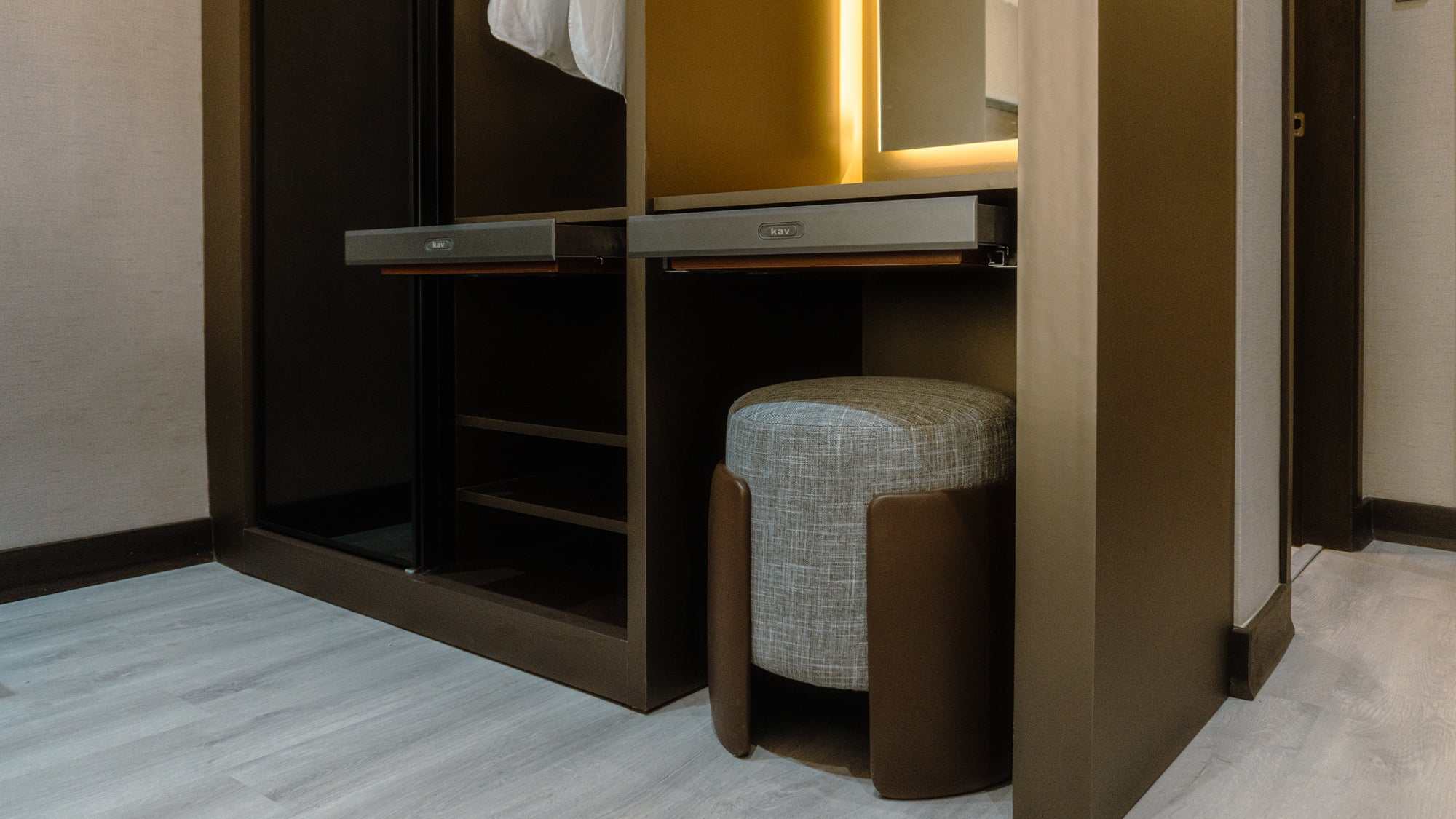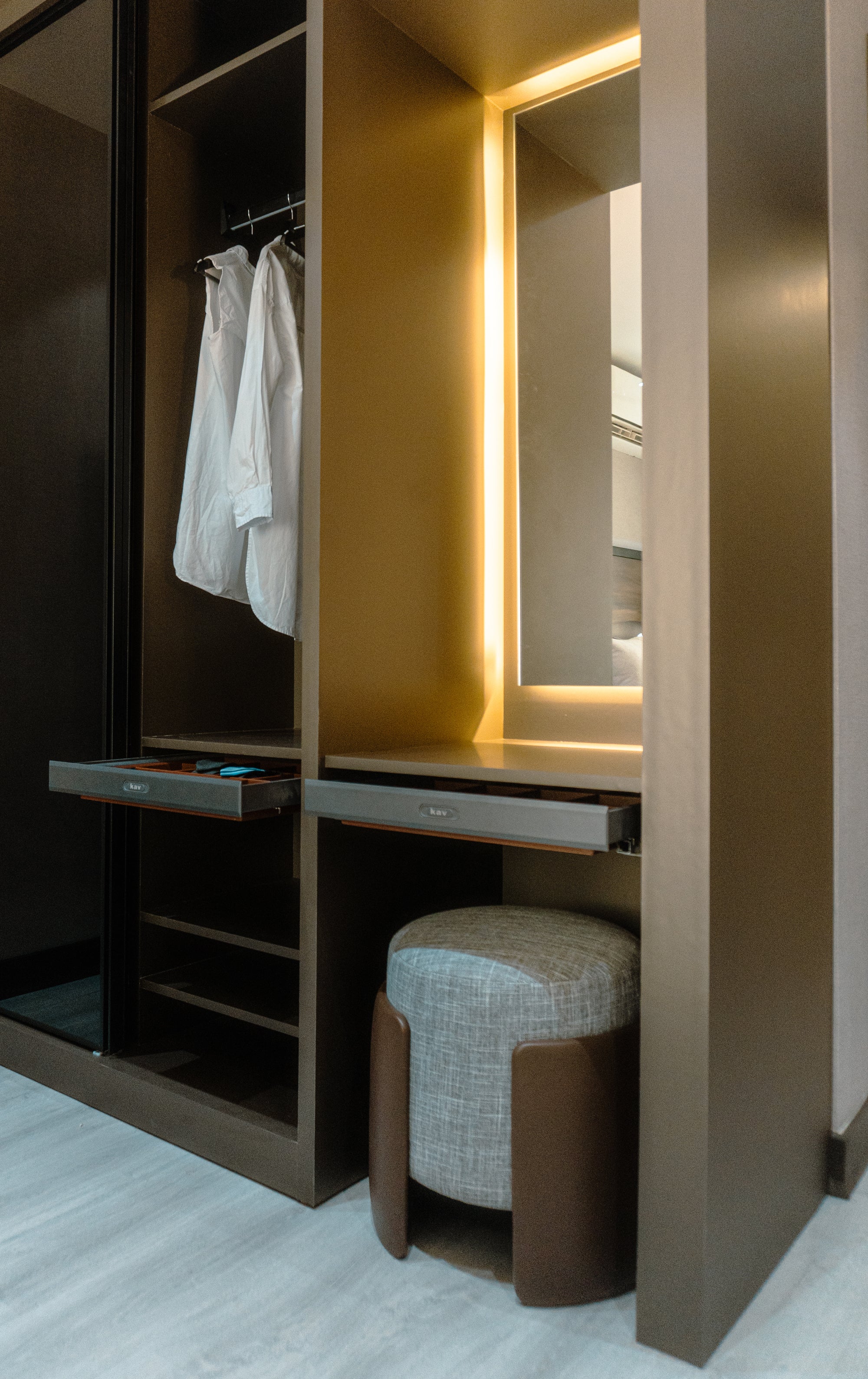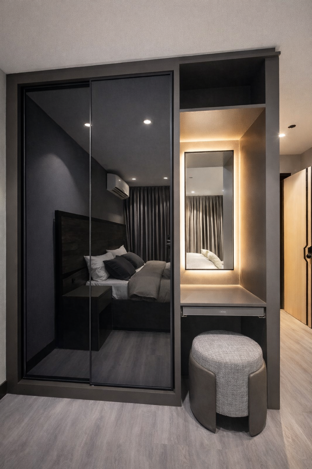 A refined expression of modern living, this built-in closet blends form and function with quiet elegance. Dark, soft cabinetry texture, tinted glass panels that softly mirror the room, adding depth without visual weight. A thoughtfully integrated dressing niche—complete with a full-height mirror, concealed storage, and a plush ottoman—creates an intimate moment of daily ritual. Clean lines, muted tones, and balanced proportions give the piece a timeless, hotel-inspired sophistication.