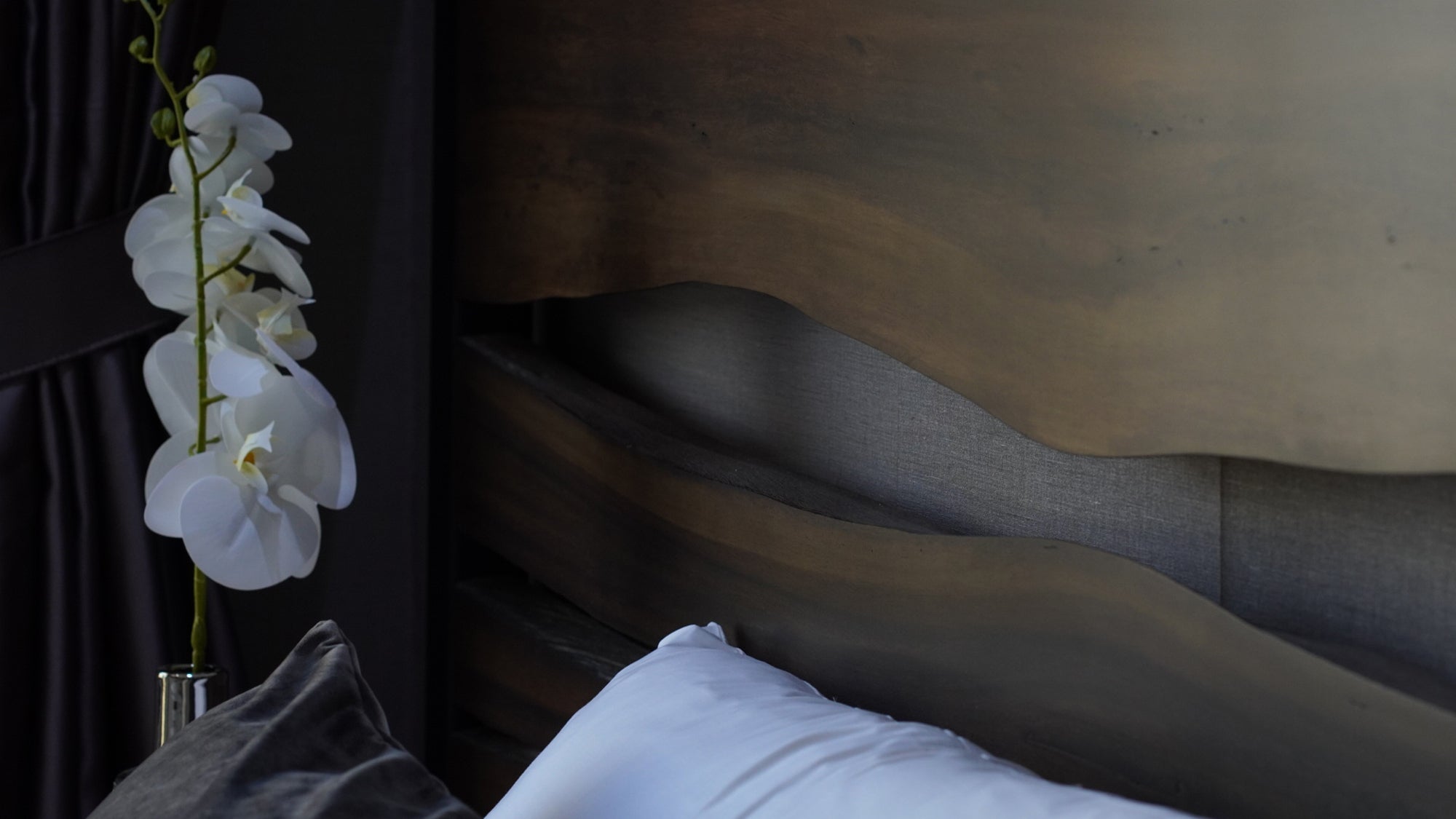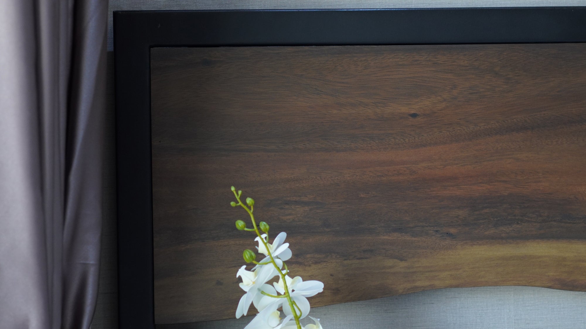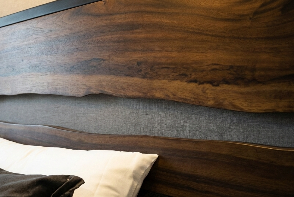 This bed is a refined expression of natural strength and modern craftsmanship. The headboard is crafted from solid acacia wood with a live-edge detail, finished in a deep, dark stain that highlights the wood’s rich grain and organic character. Each natural contour adds depth and individuality, turning the headboard into a subtle statement piece.