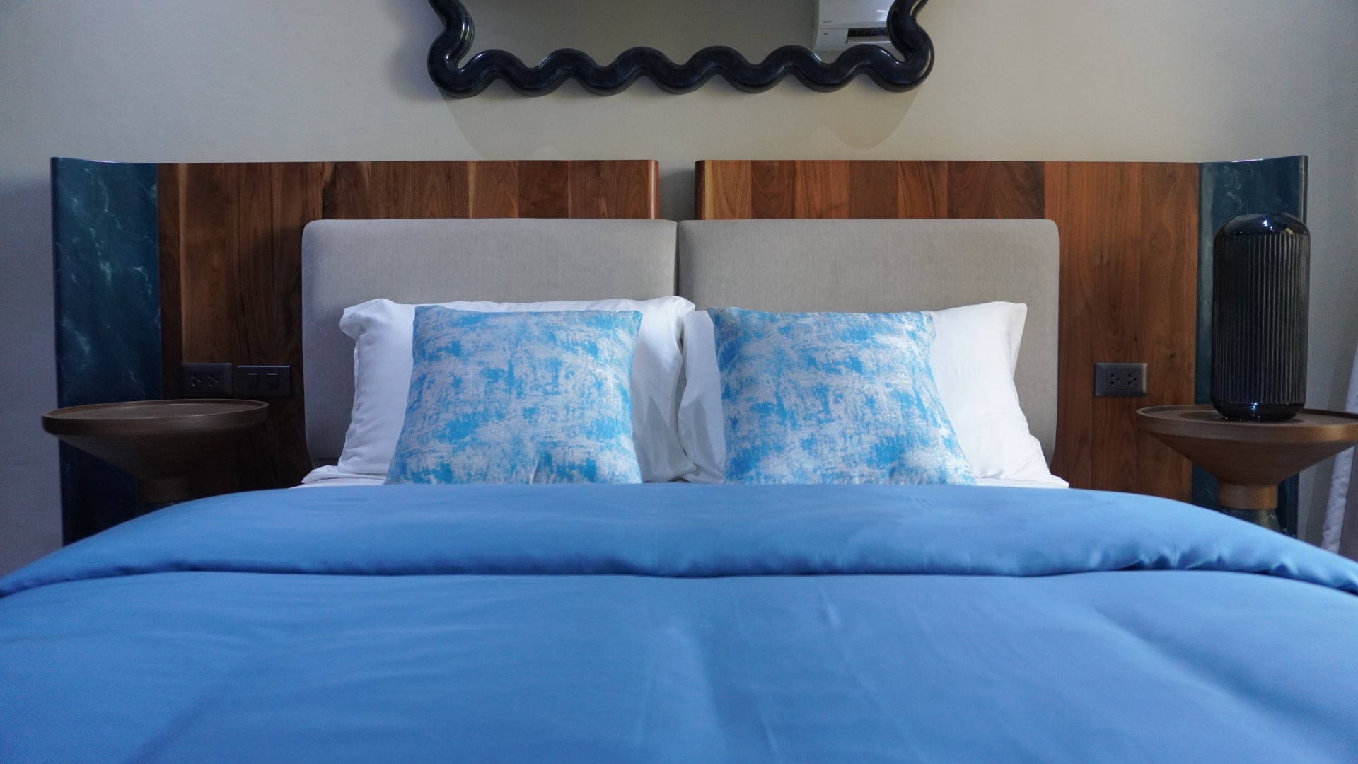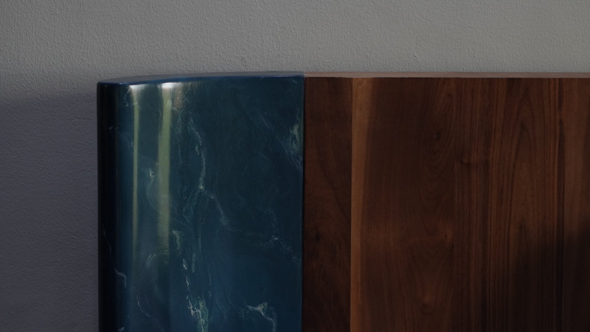 This bed is a refined blend of natural warmth and contemporary artistry. The headboard is crafted from rich walnut wood, its deep, earthy tones beautifully contrasted by a blue resin accent that flows through the design like a quiet ribbon of water. The resin detail adds a subtle sense of movement and modern character, elevating the headboard beyond the traditional.