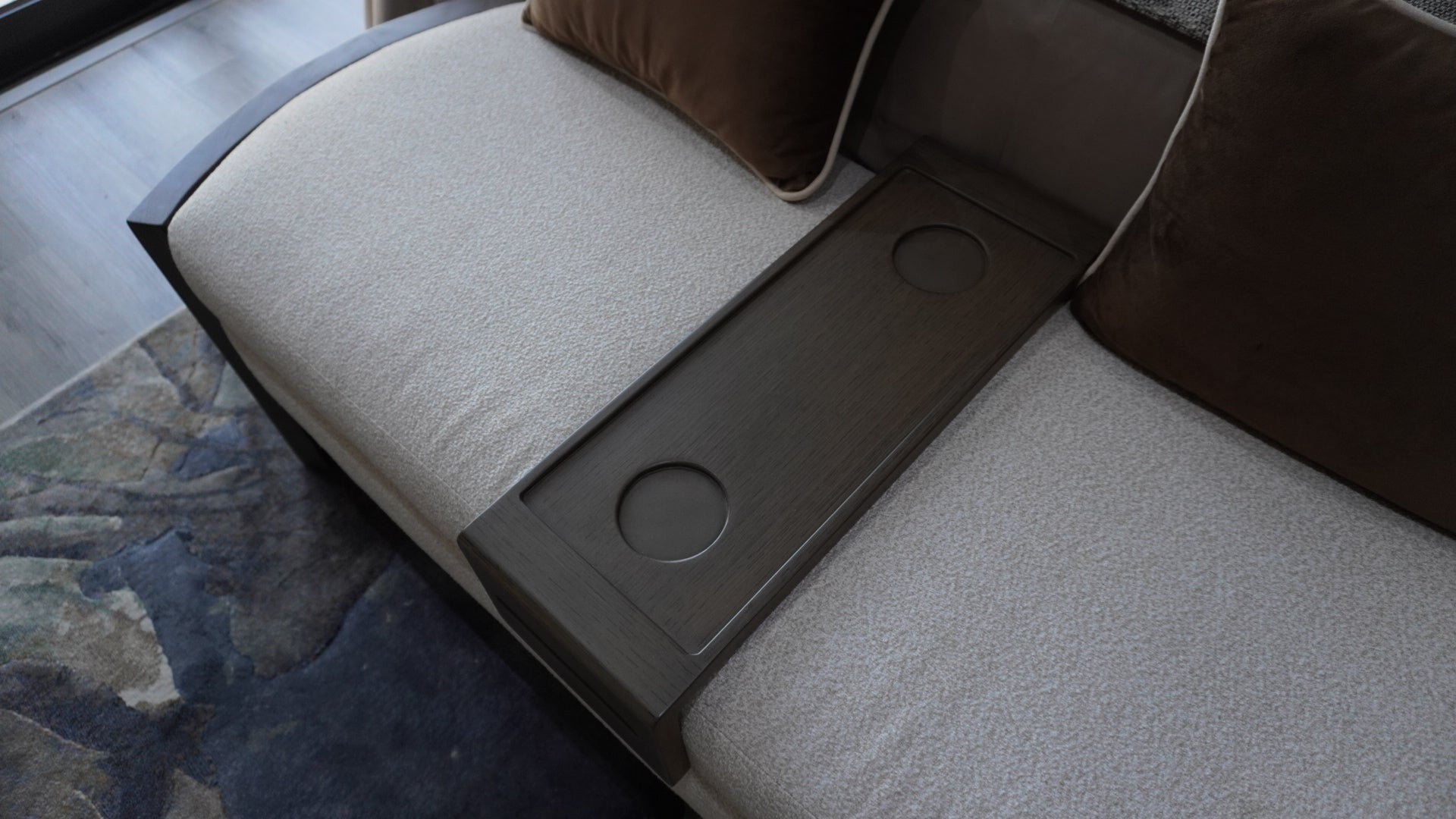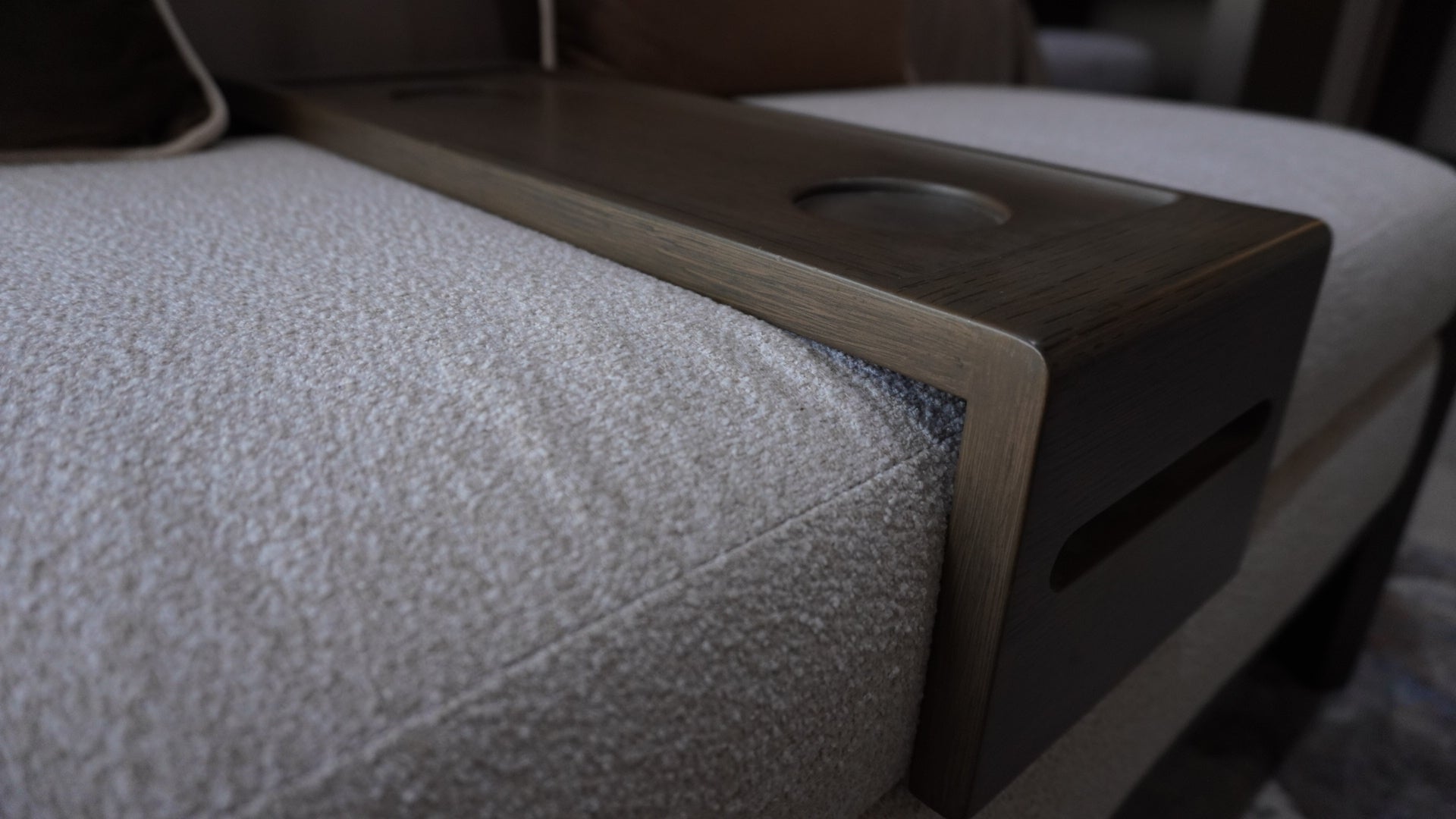 This piece is a refined expression of comfort shaped by craftsmanship. Featuring a generously cushioned seat upholstered in a soft, neutral fabric, it invites relaxation while maintaining a clean, tailored look. The design is complemented by dark-stained wood side panels with smooth, rounded edges, giving the chair a grounded, architectural presence.