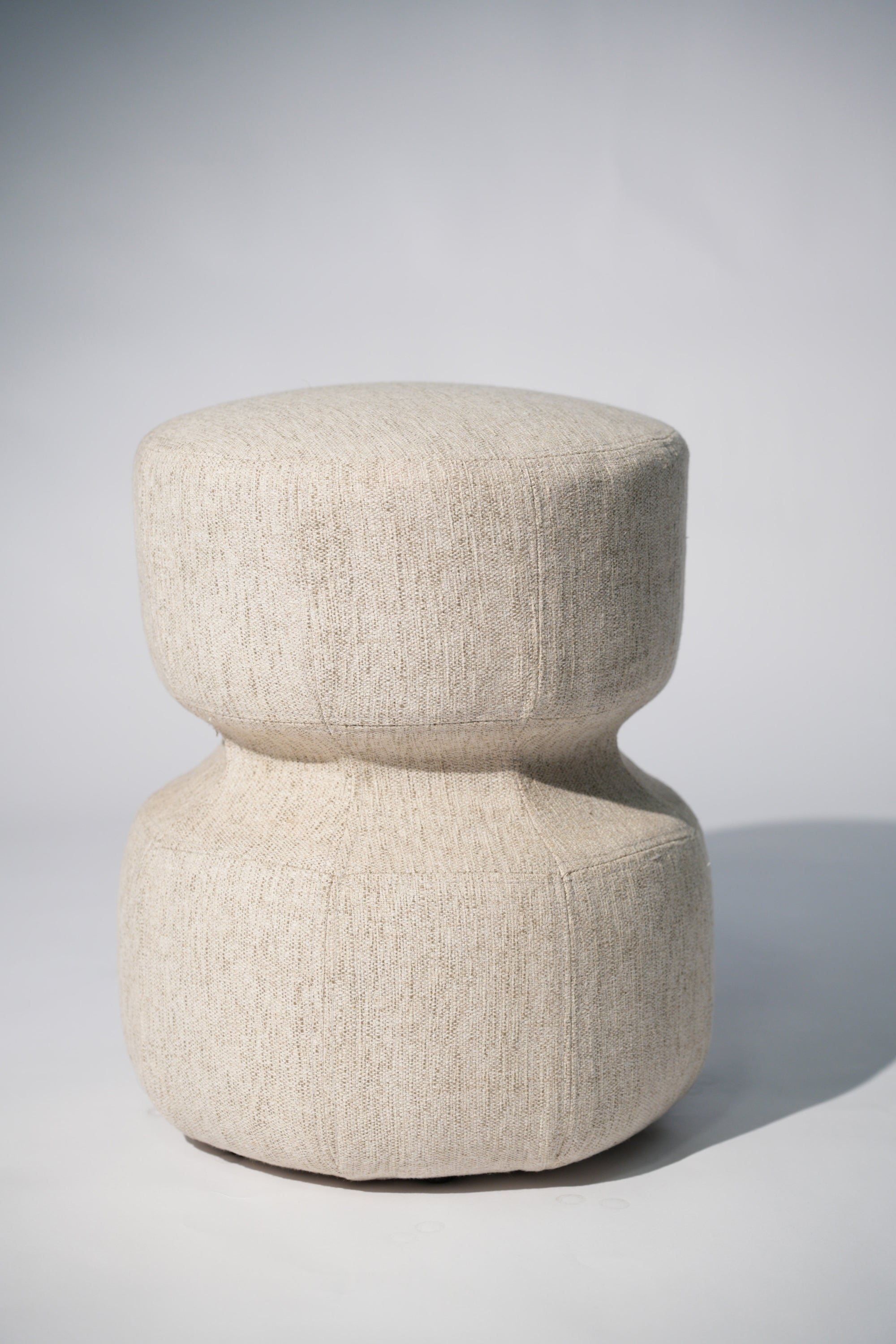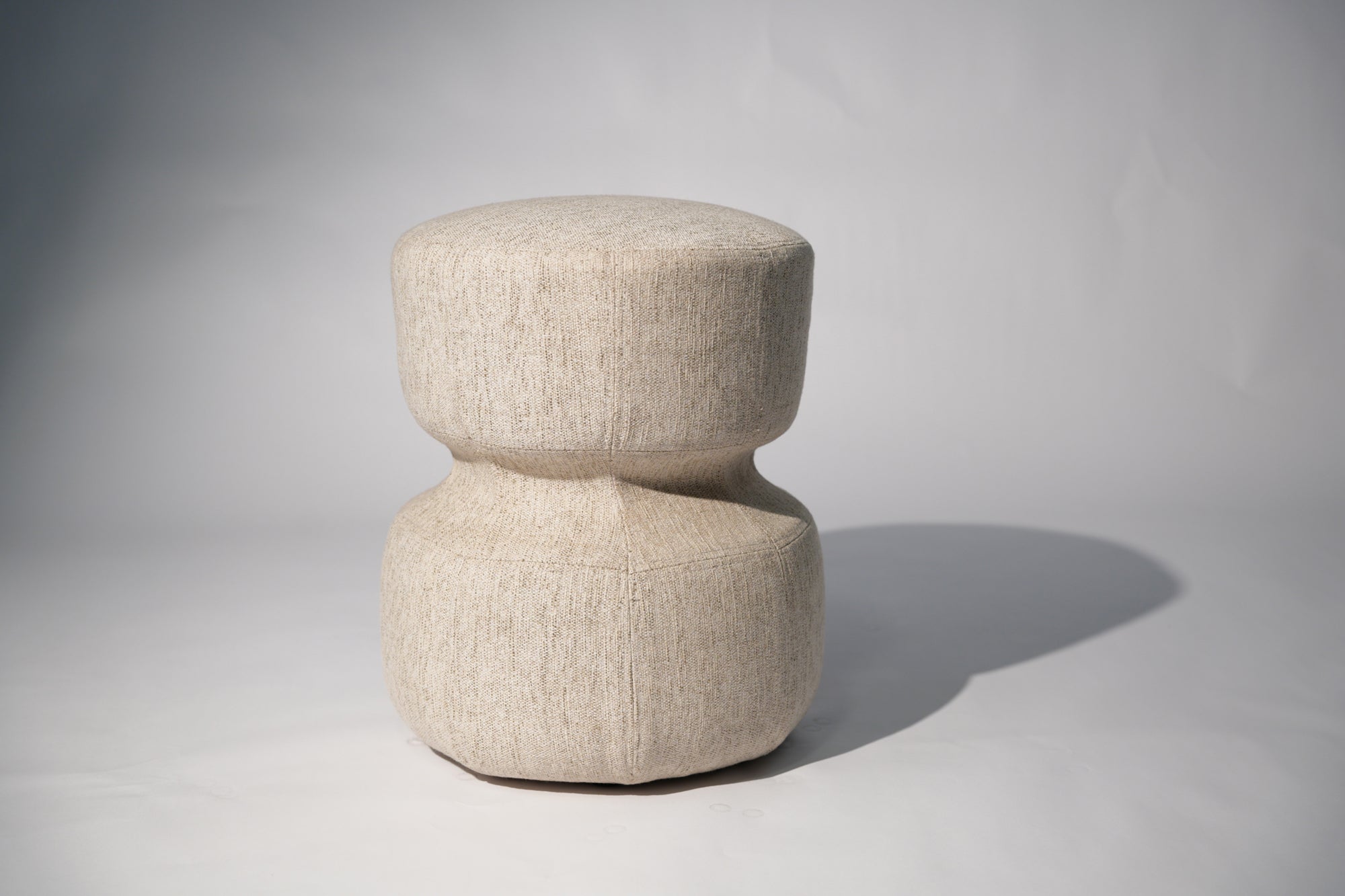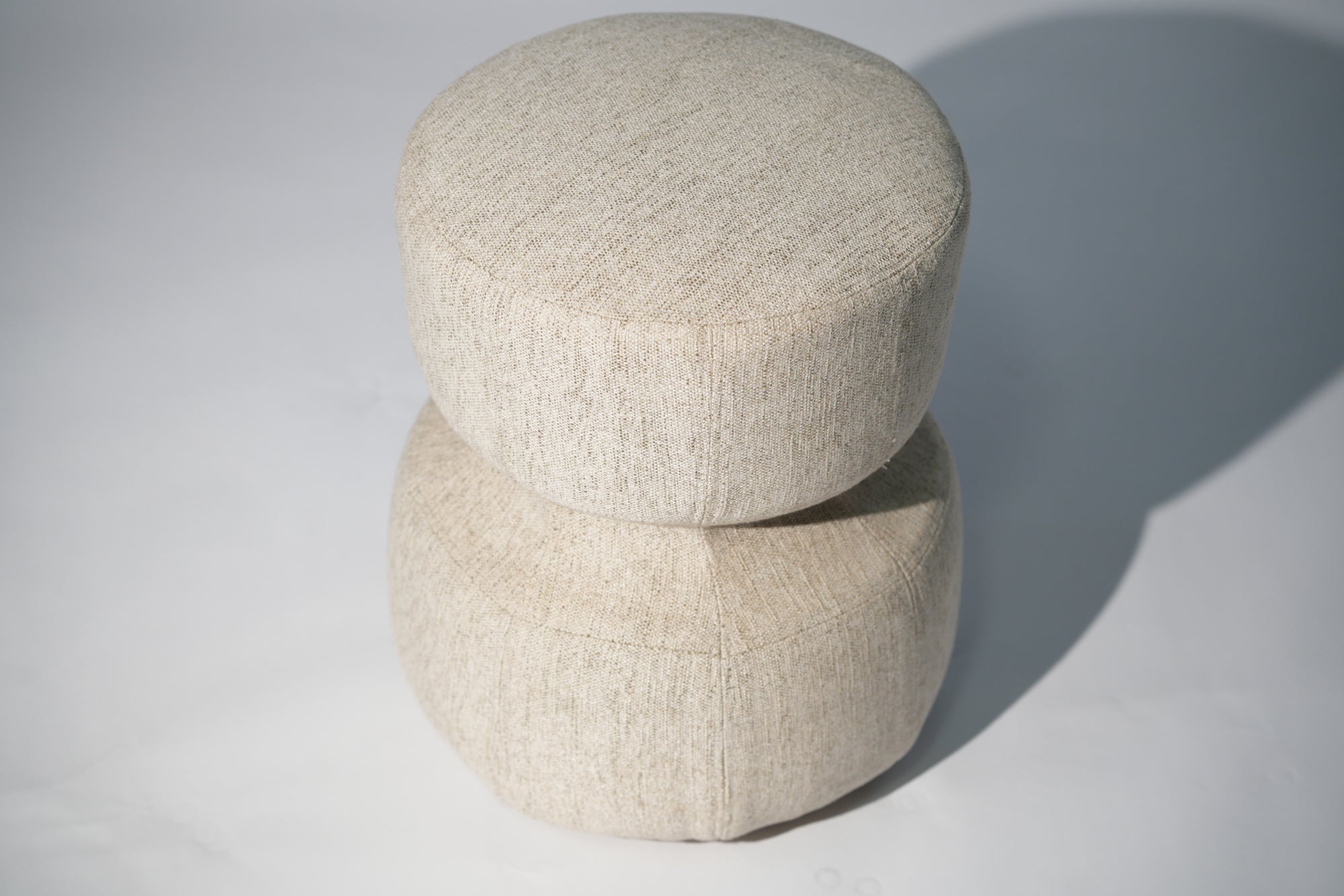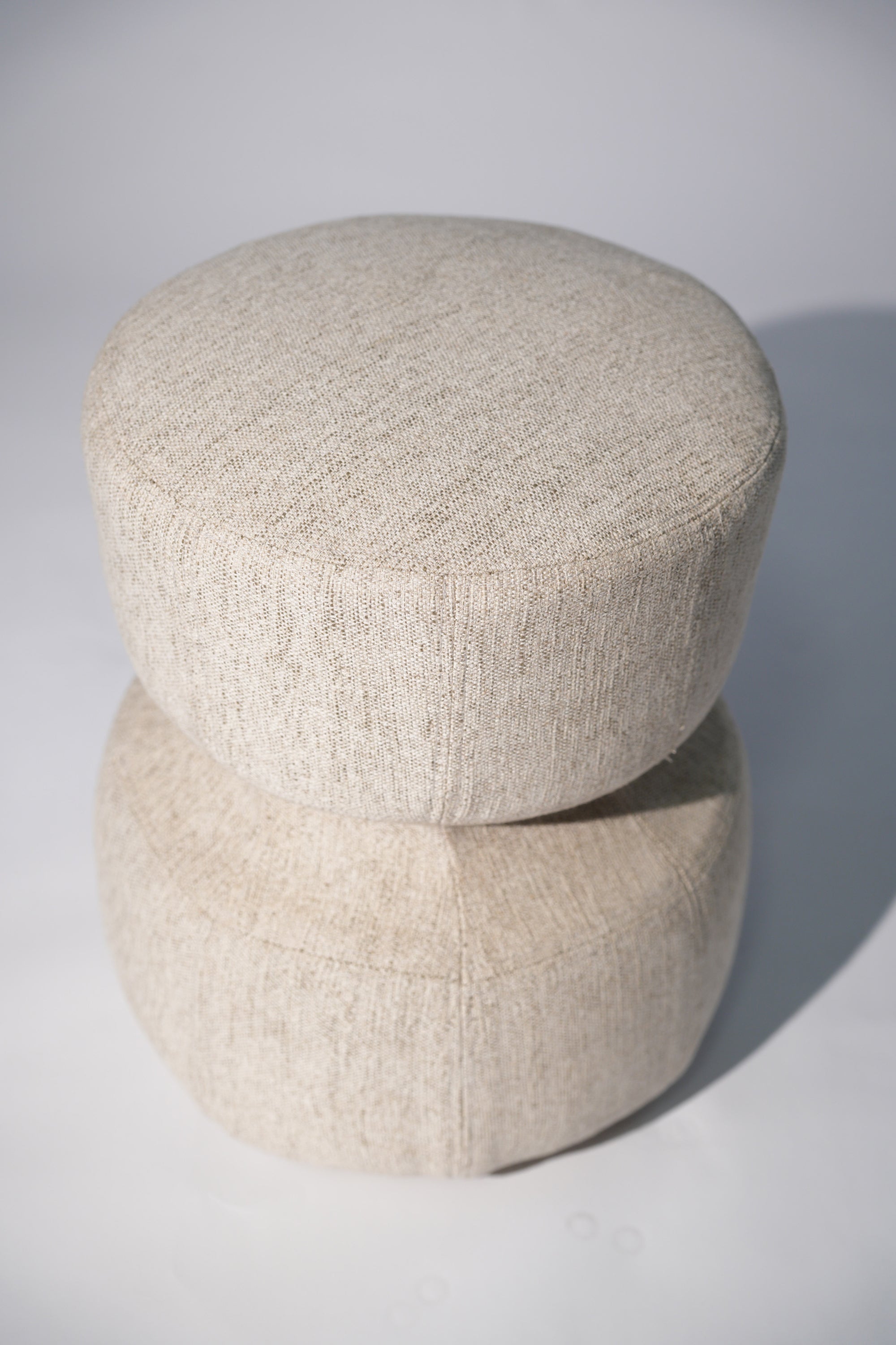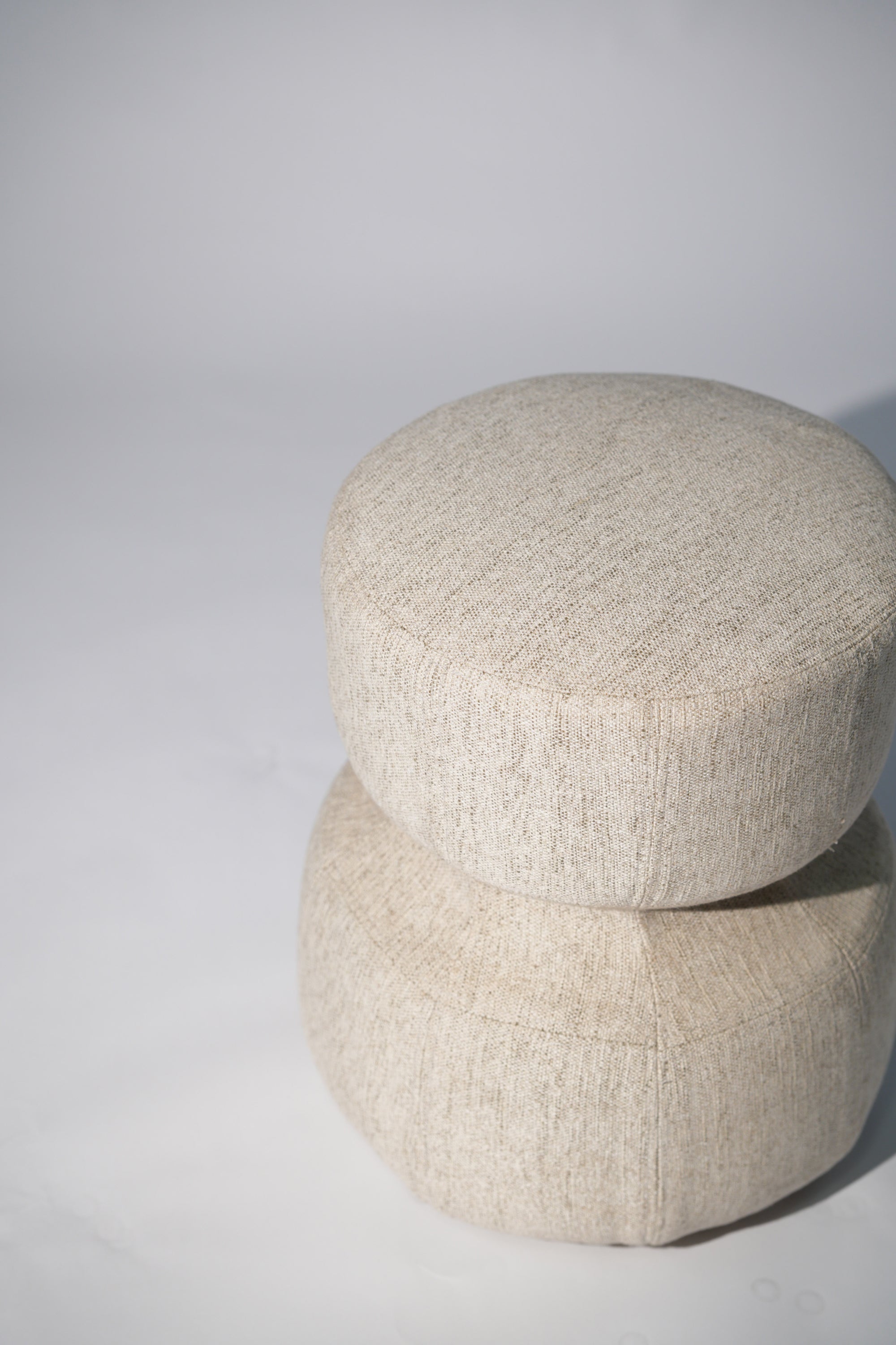 This ottoman is a sculptural expression of soft form and modern simplicity. Upholstered in a light, textured fabric, its gently contoured, stacked silhouette creates a sense of balance and visual rhythm. The rounded profiles give it an inviting, tactile presence, while the seamless upholstery emphasizes its clean, minimal aesthetic.
