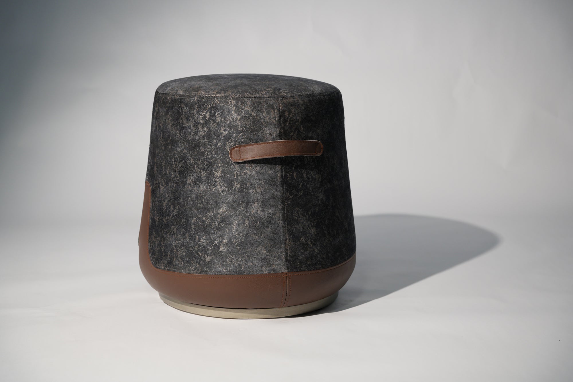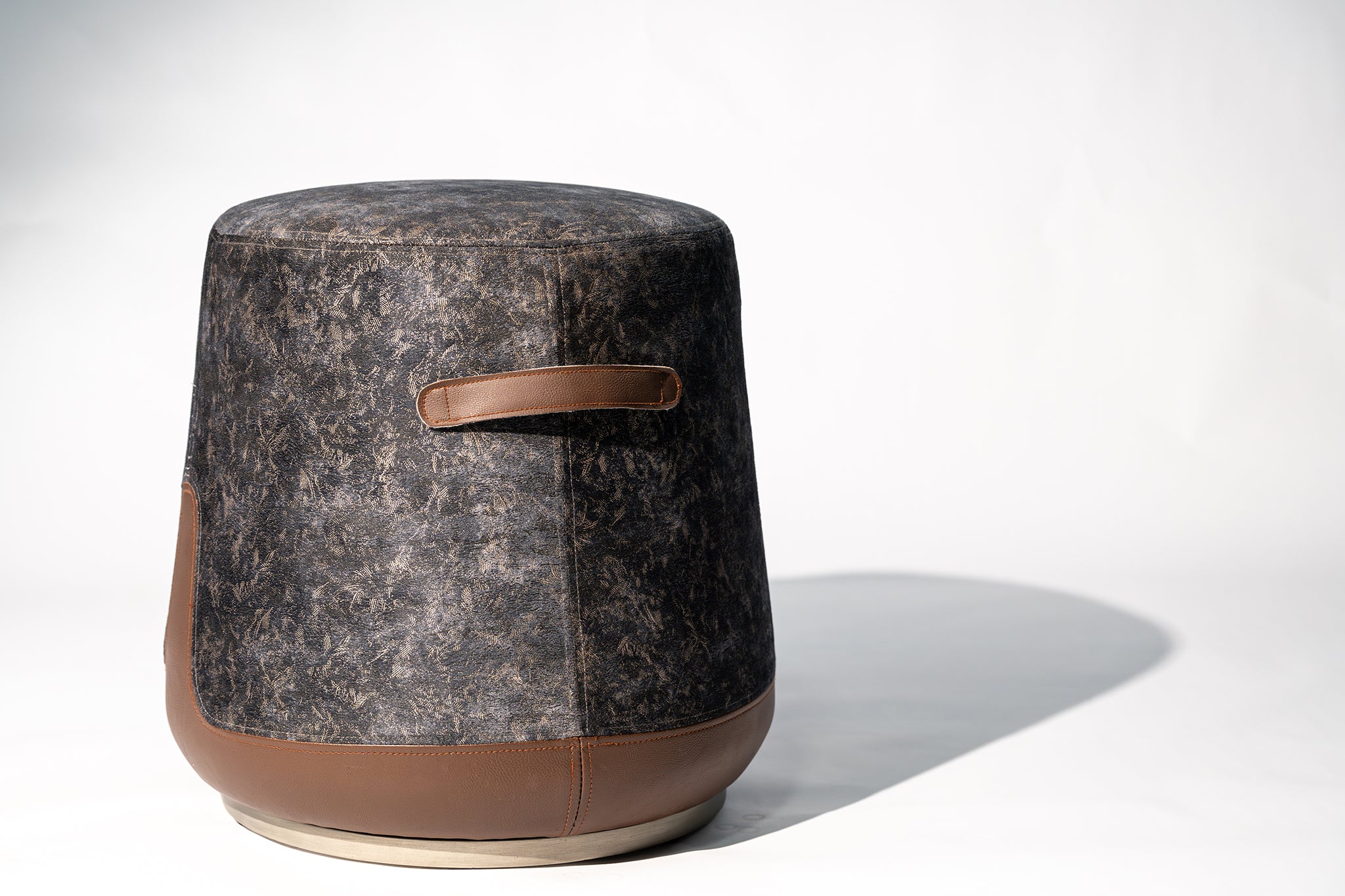 This ottoman is a refined balance of comfort, texture, and understated luxury. Upholstered in a richly textured, dark-toned fabric, it carries a subtle, organic pattern that adds depth and visual interest. A warm leather accent band and integrated handle wrap around the form, introducing a tactile contrast and a touch of craftsmanship.