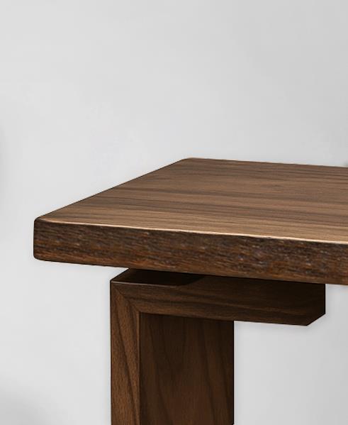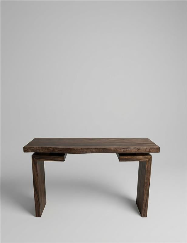 Solid acacia wood console table with a clean, architectural silhouette. The thick rectangular top showcases the natural grain of the wood, enhanced by a rich dark stain that adds depth and warmth. Angled legs provide a sense of balance and strength, giving the piece a grounded presence. Minimal in form yet rich in texture, this console is designed to sit effortlessly in entryways, living spaces, or behind a sofa, offering both function and understated character.