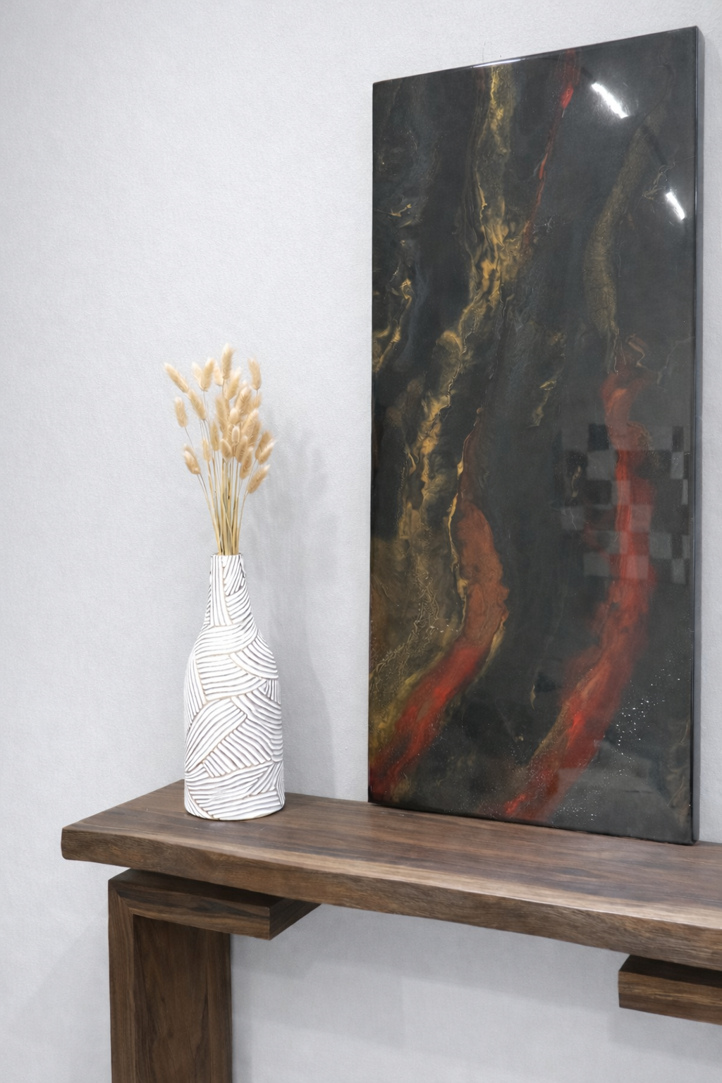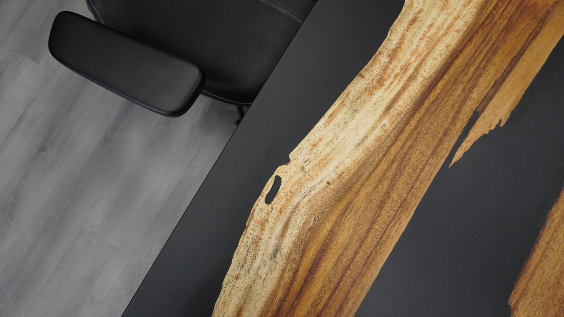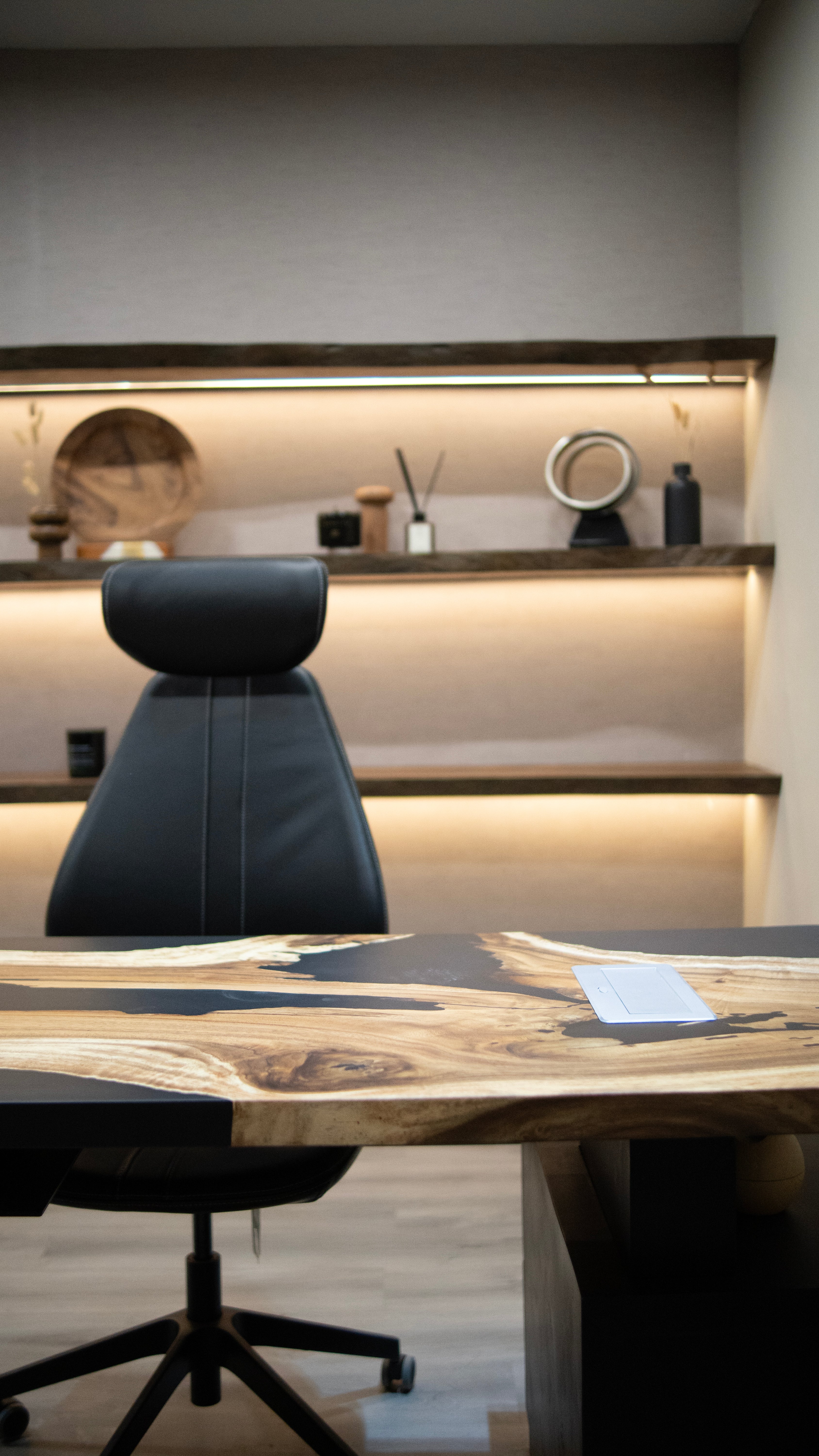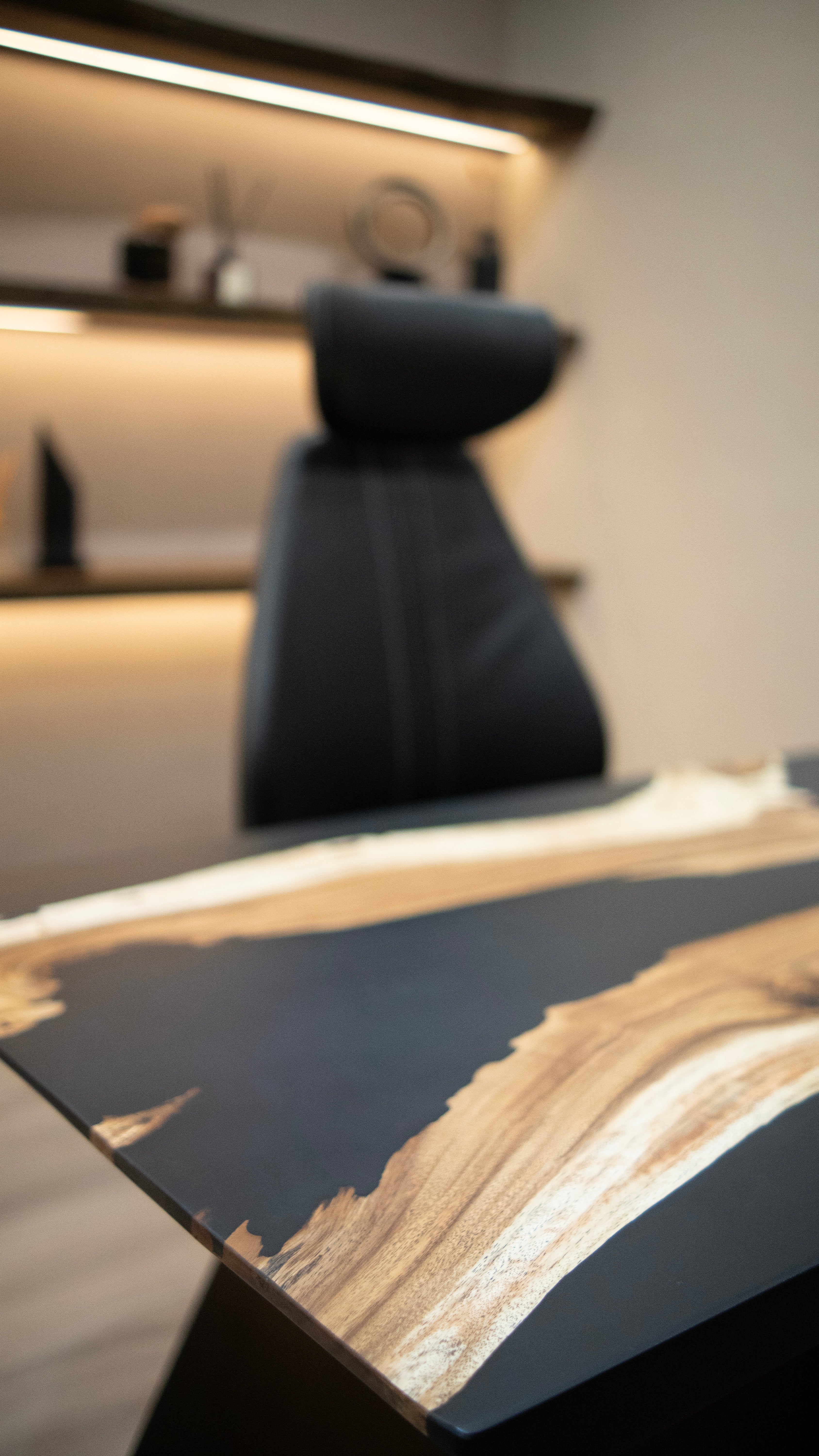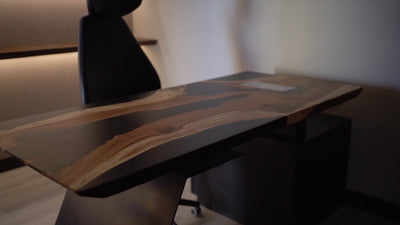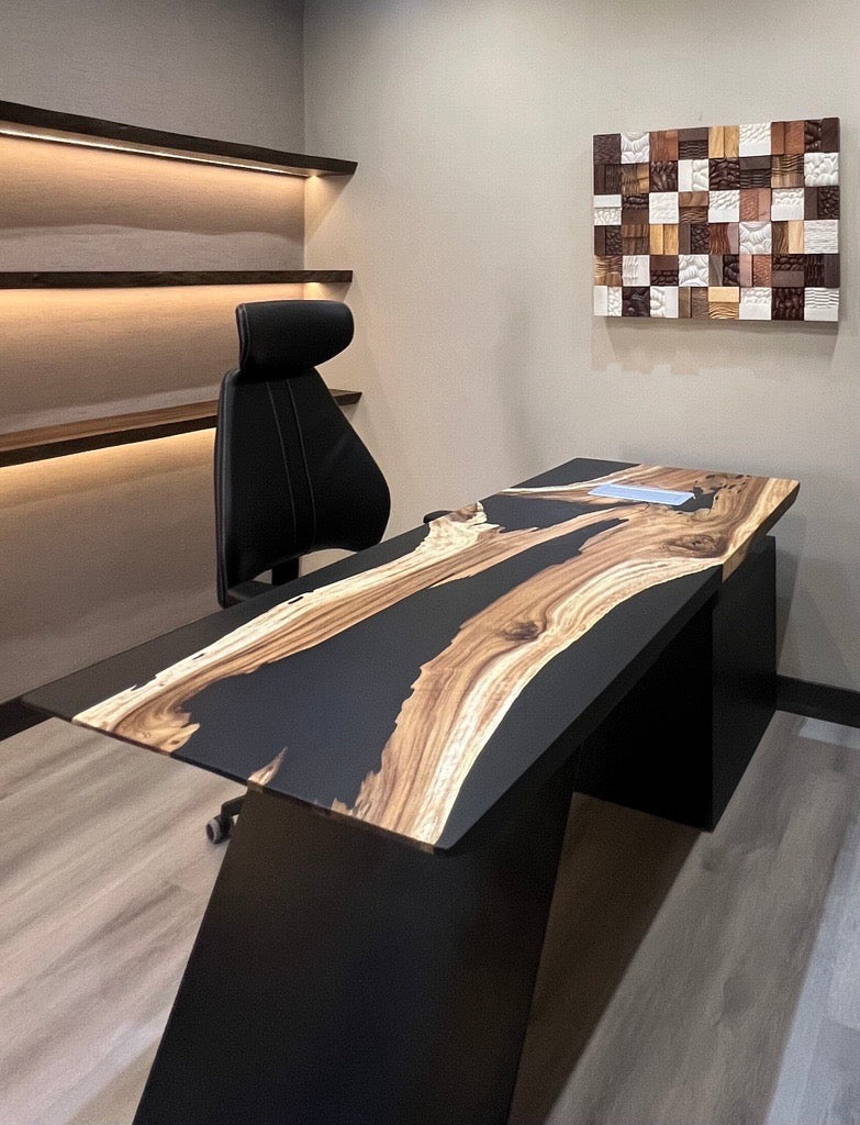 A complete fusion of modern and minimalist design, this organic office table harmonizes natural elements with unique aesthetic, featuring a unique fusion of organic shape, raw material and sleek resin accent.