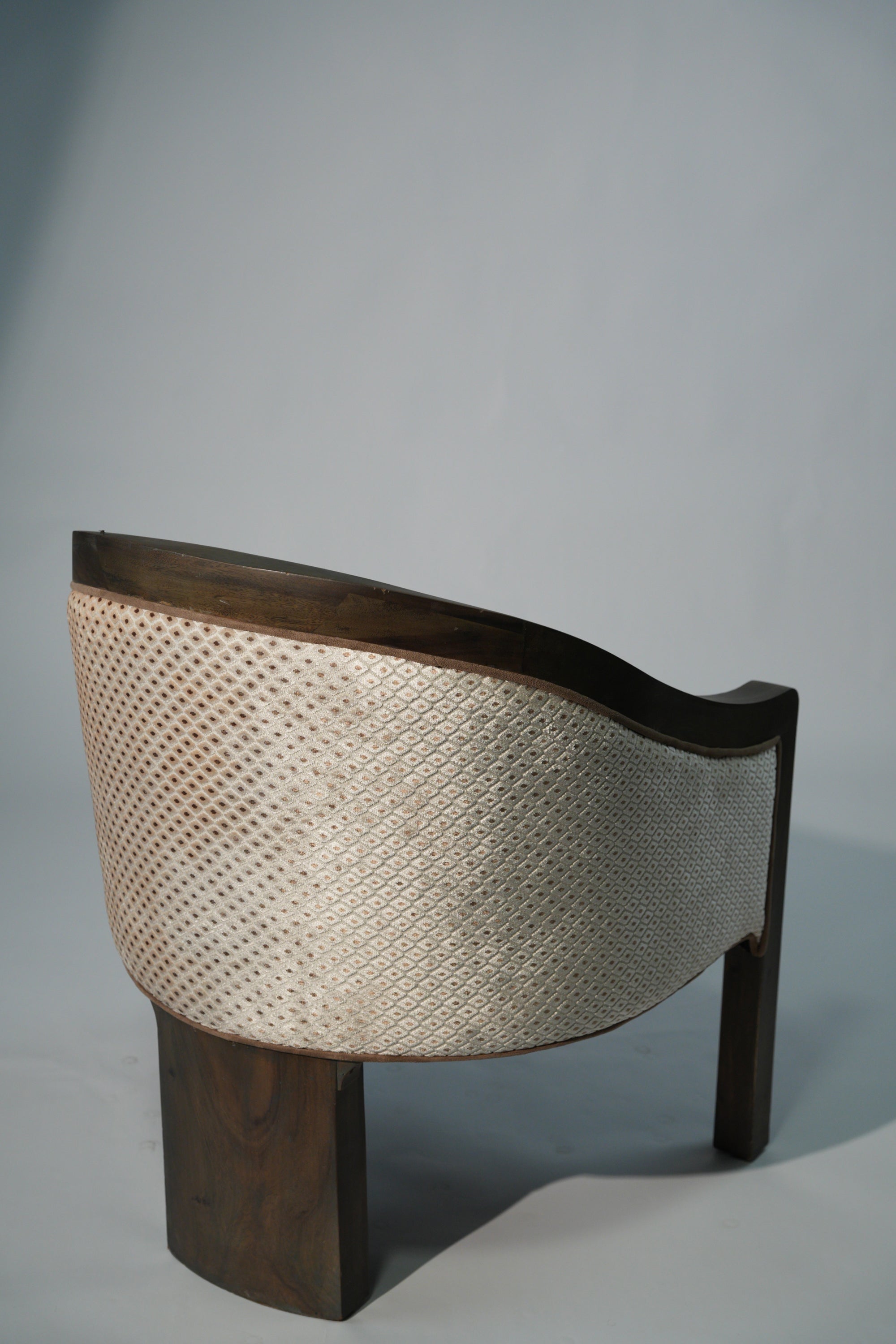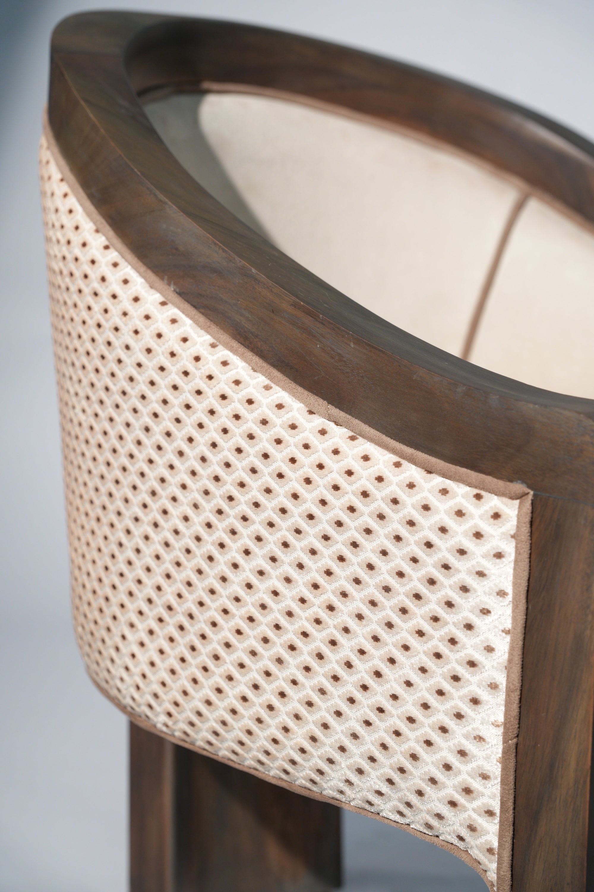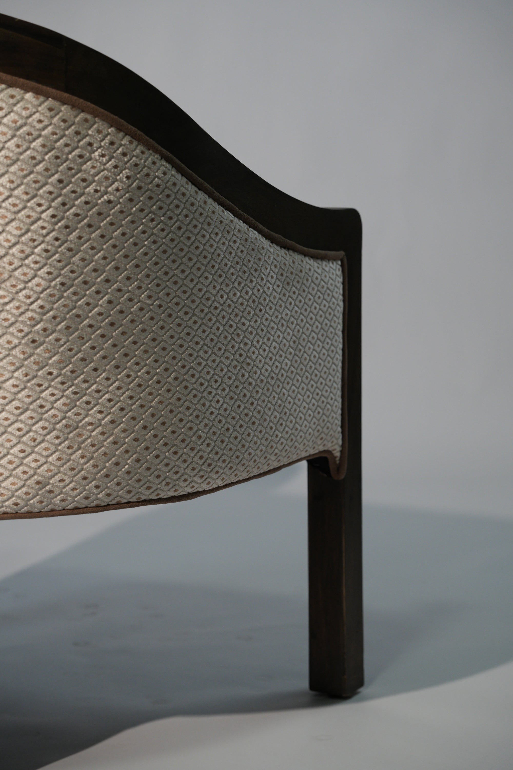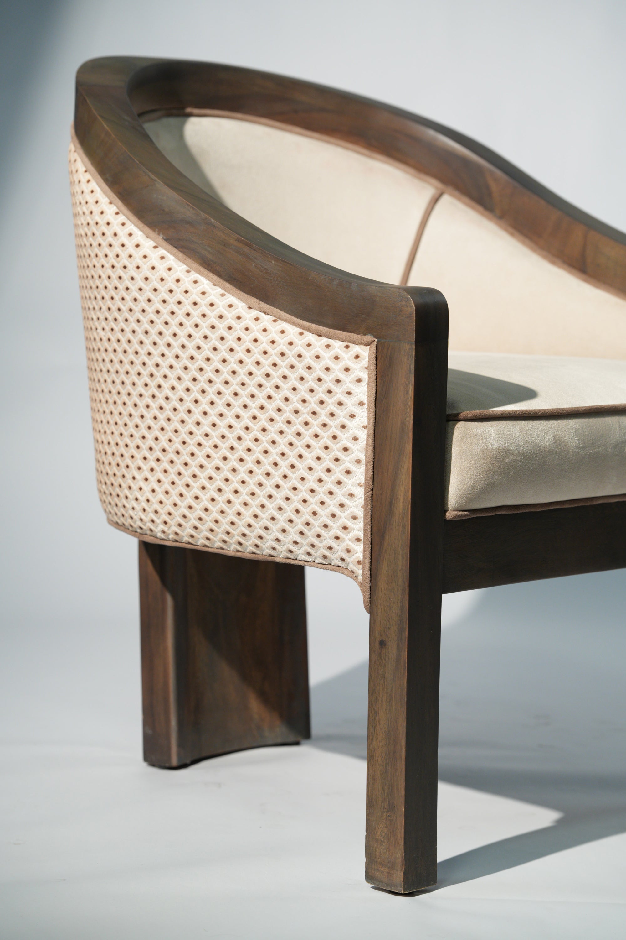 A sculptural lounge chair defined by soft curves and thoughtful detail. The solid wood frame flows seamlessly into a gently arched back, complemented by a fabric side panel adorned with subtle printed patterns that add character and visual rhythm. Plush, light-toned upholstery offers a calm contrast, inviting comfort while highlighting the chair's refined craftsmanship. A timeless piece that brings quiet elegance and artistic expression to any interior.
