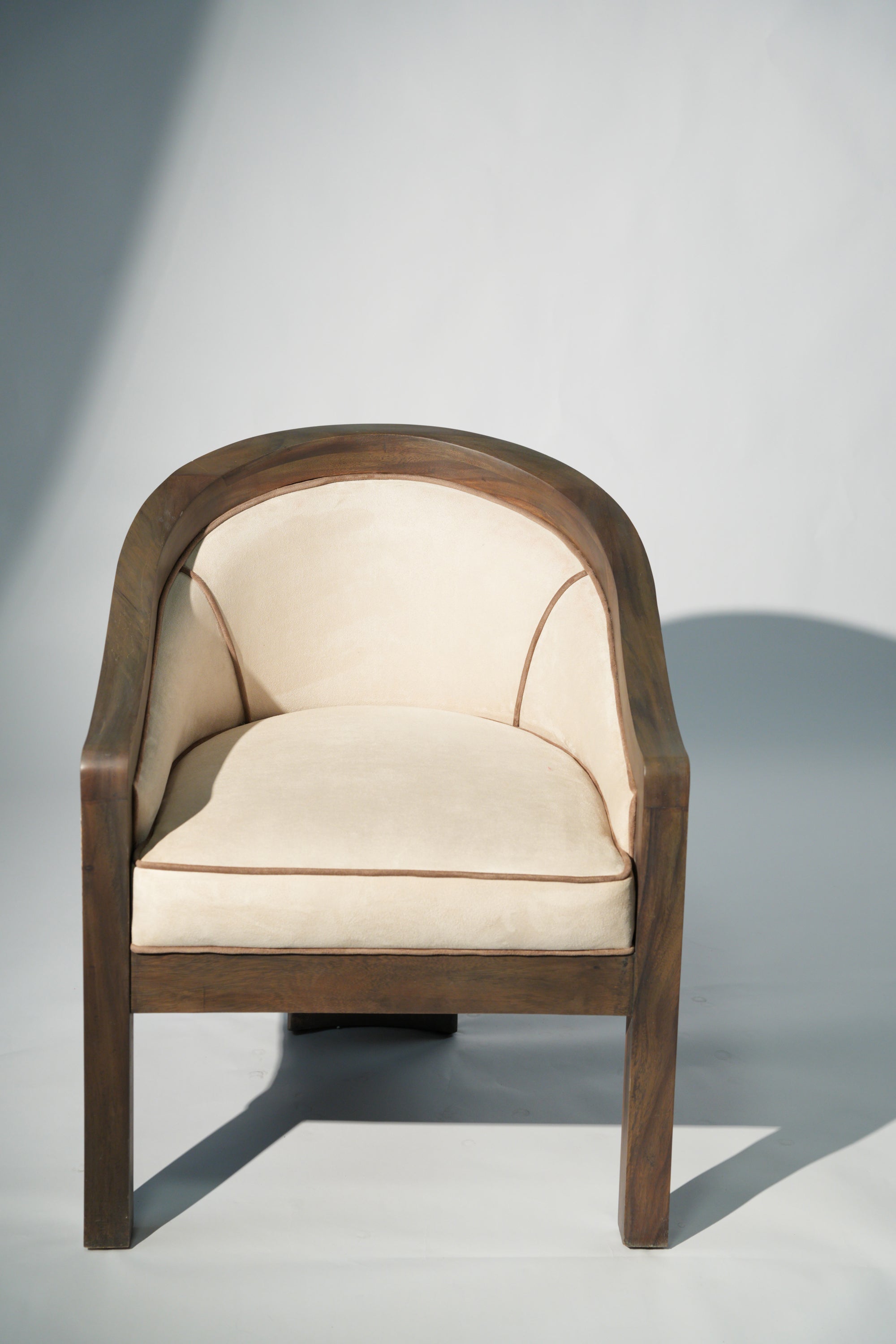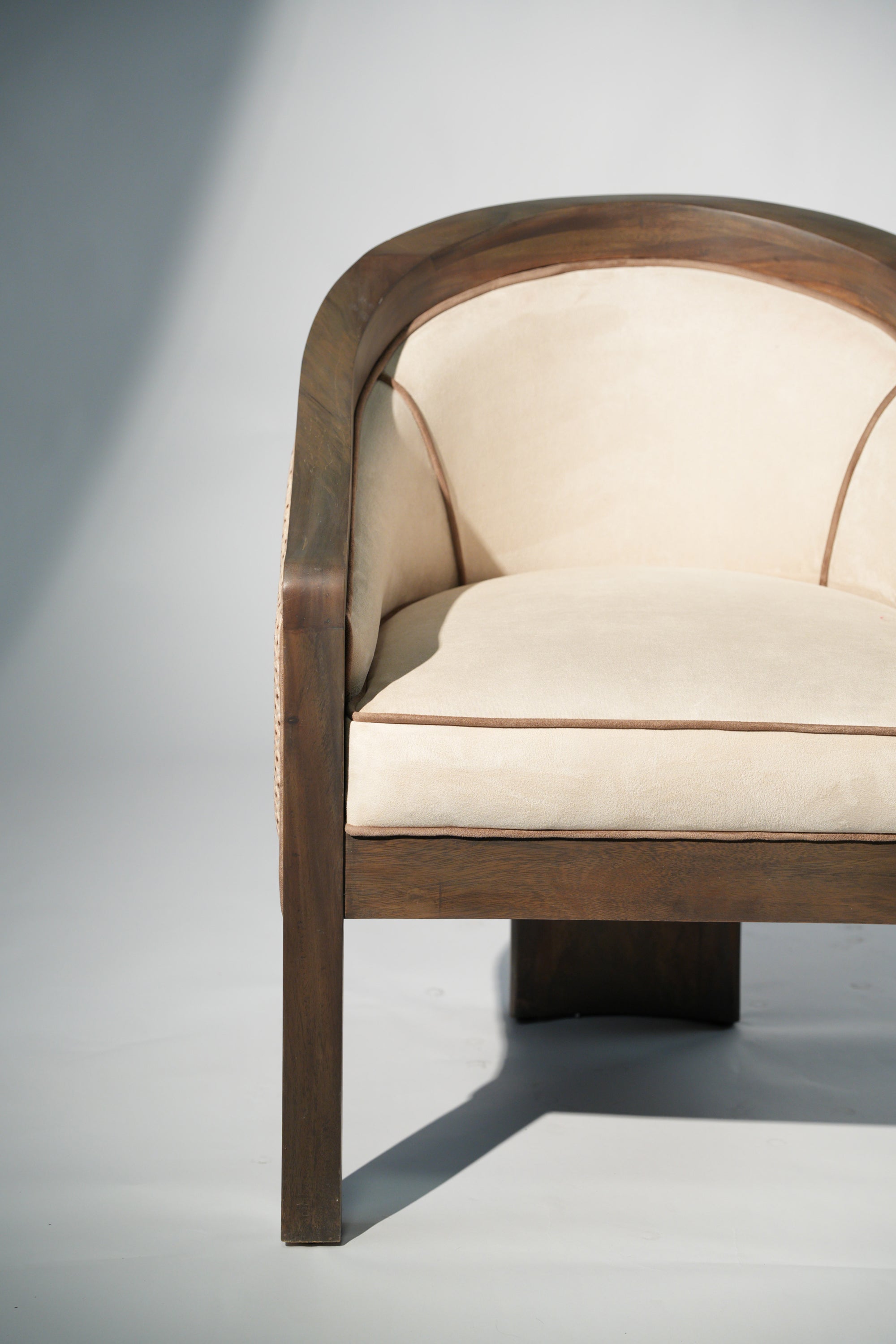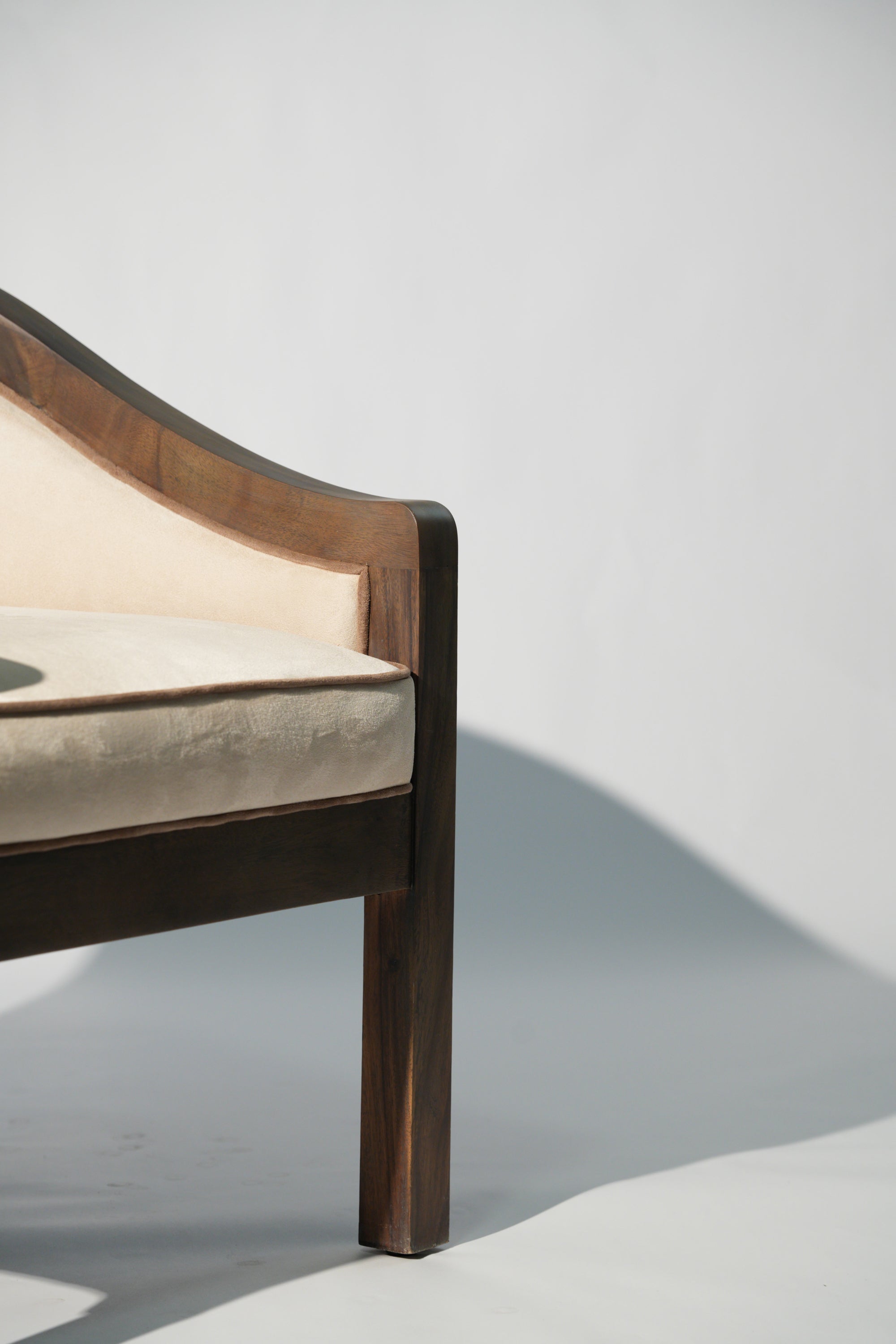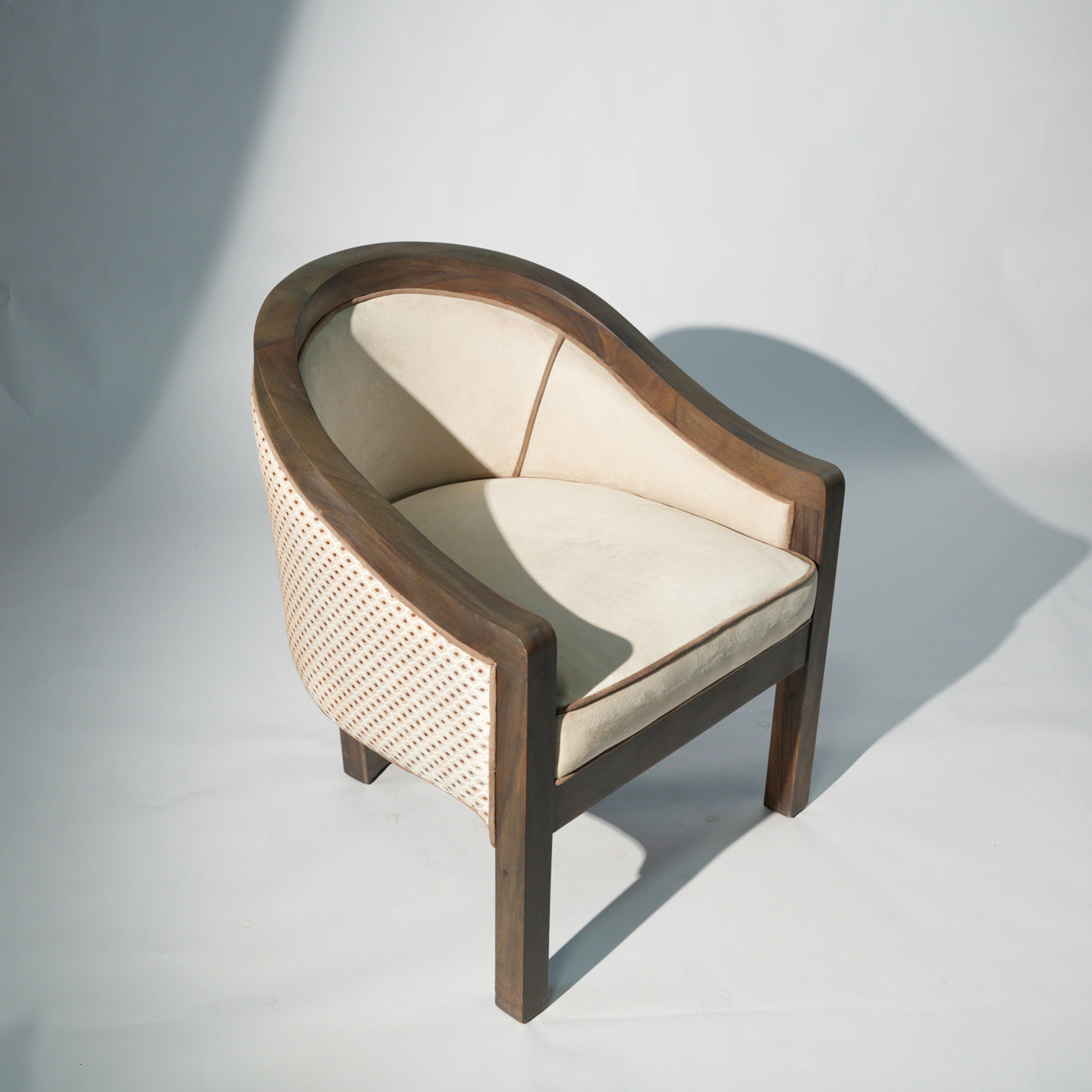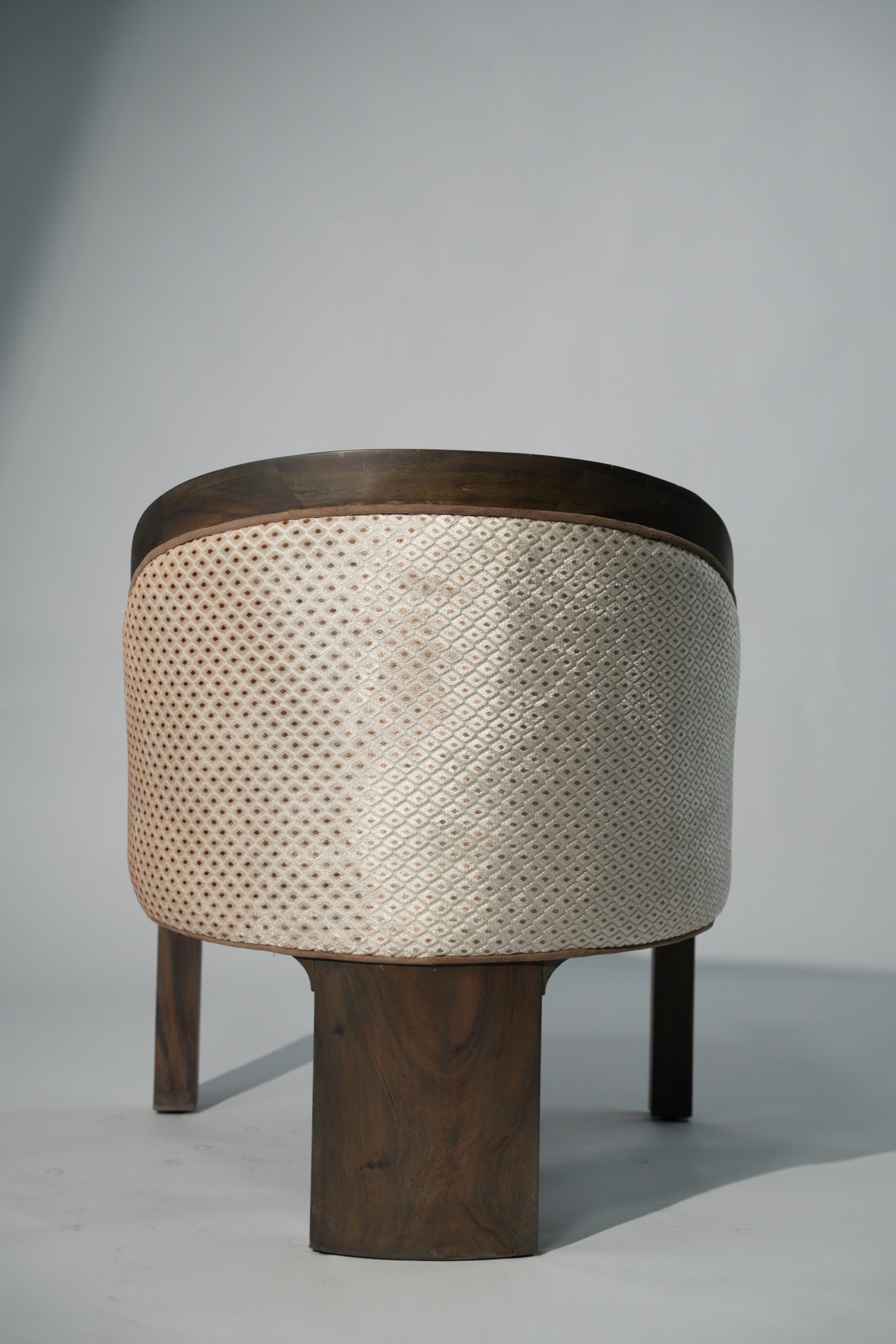 A sculptural lounge chair defined by soft curves and thoughtful detail. The solid wood frame flows seamlessly into a gently arched back, complemented by a fabric side panel adorned with subtle printed patterns that add character and visual rhythm. Plush, light-toned upholstery offers a calm contrast, inviting comfort while highlighting the chair's refined craftsmanship. A timeless piece that brings quiet elegance and artistic expression to any interior.