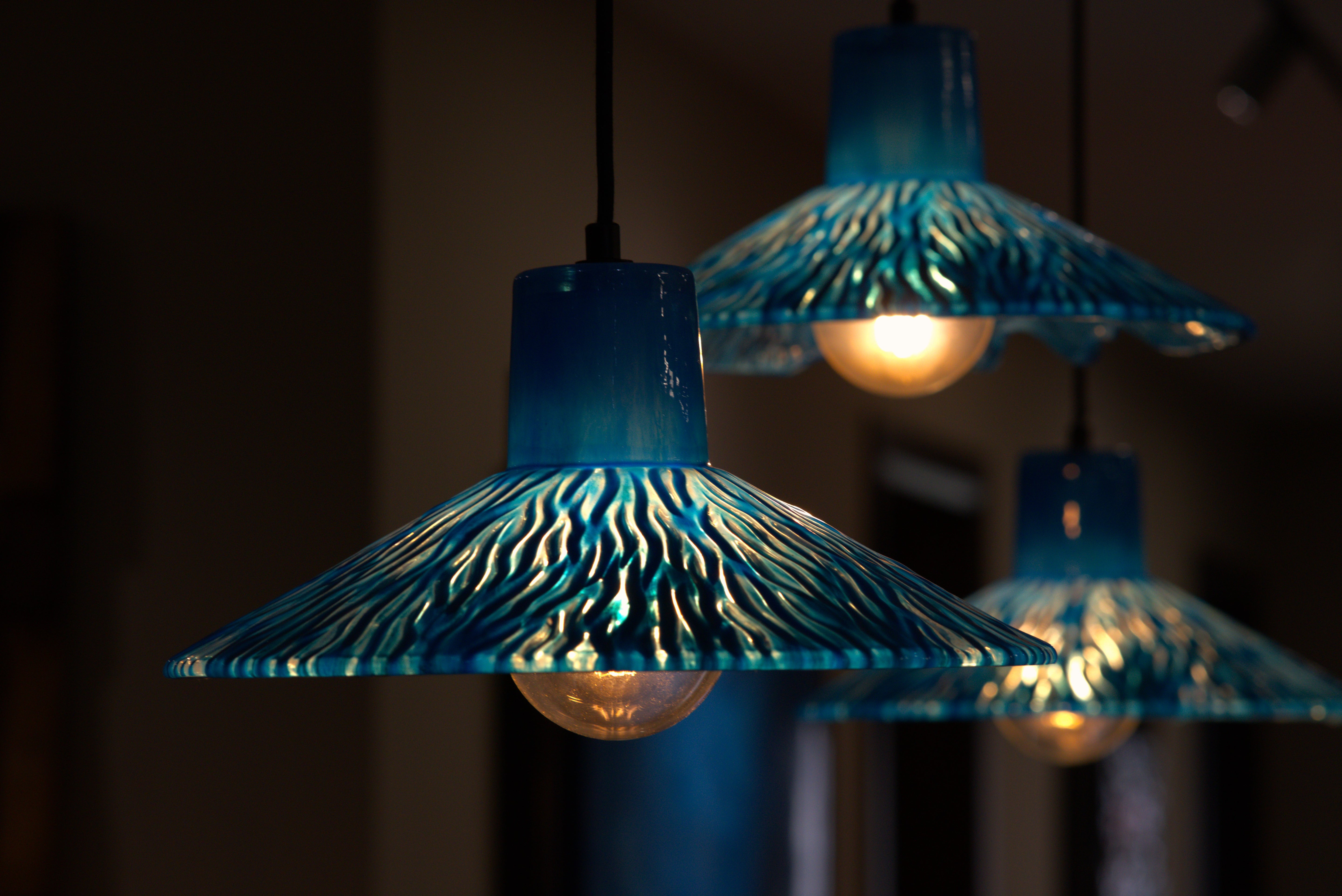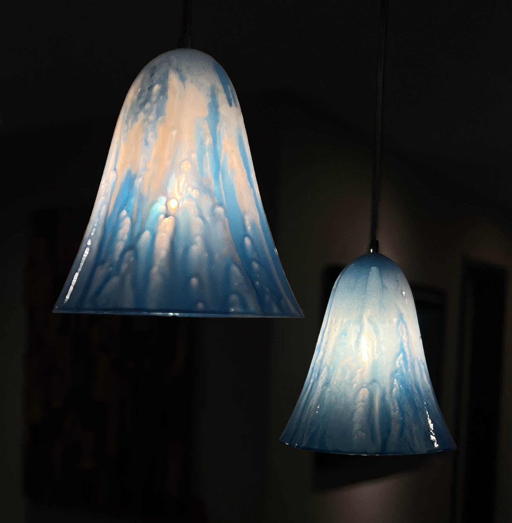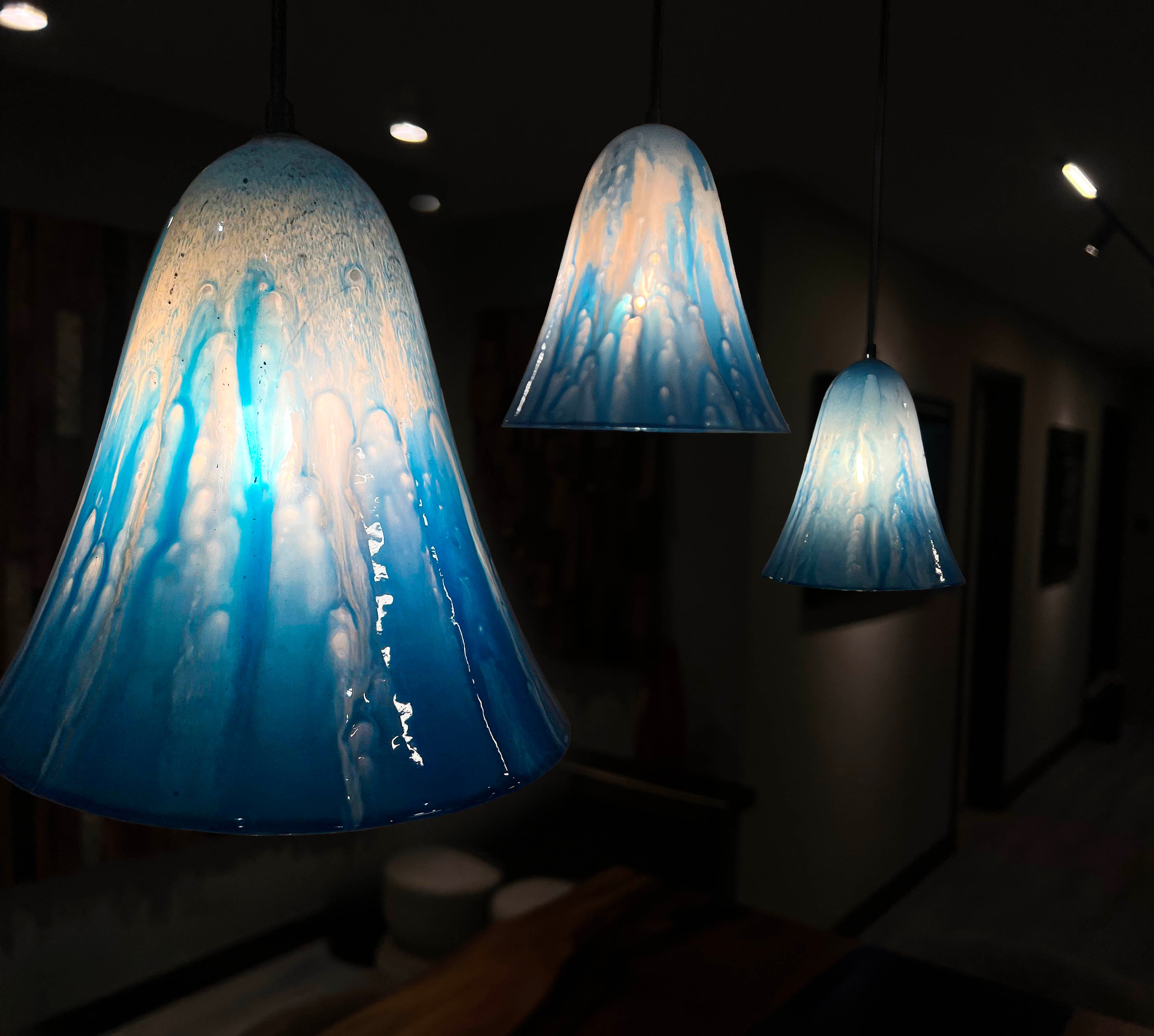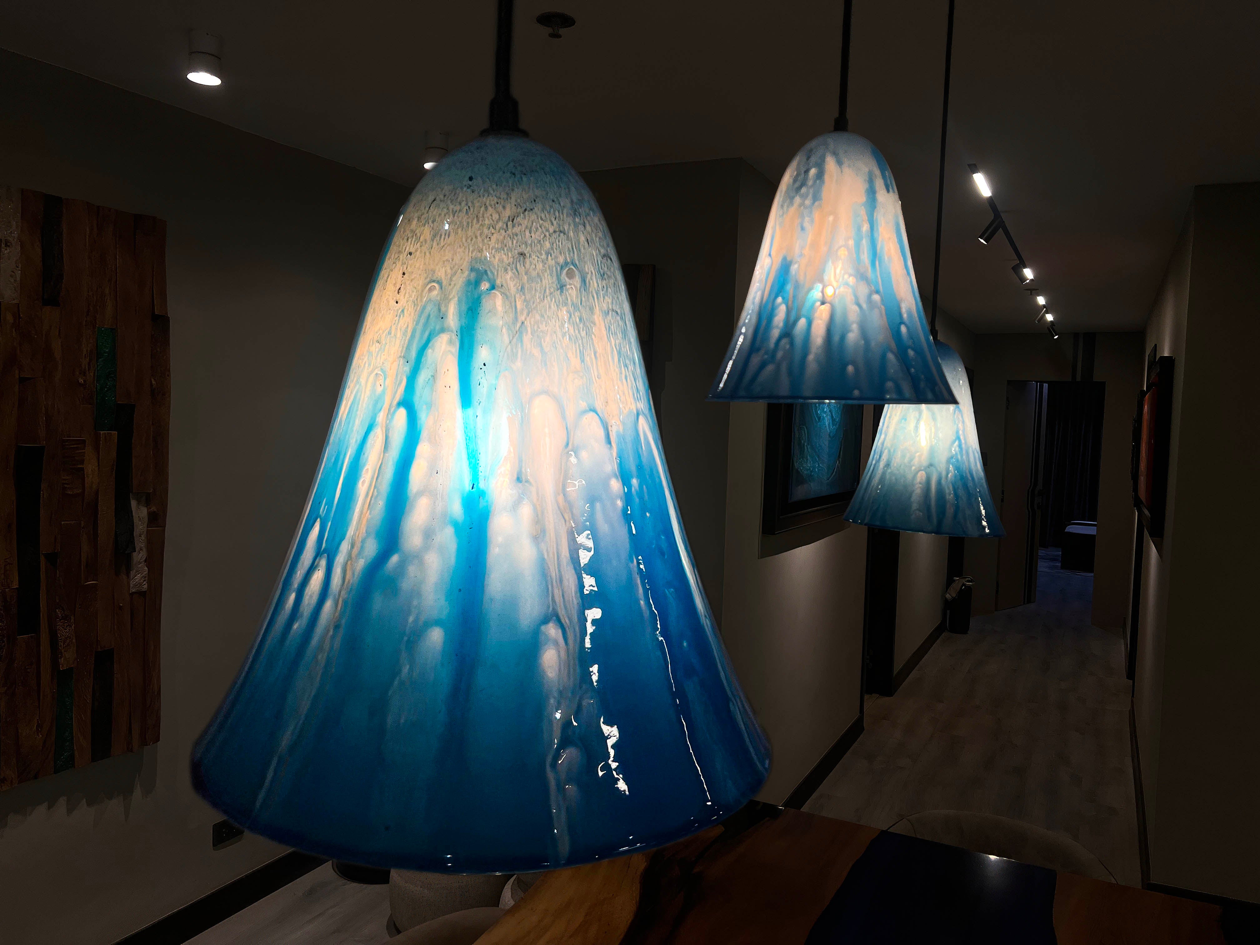 These pendant lights glow like a jellyfish in the sea, floating softly in the darkness with a quiet, ethereal presence. Their rippled blue glass captures the movement of water, diffusing light as if it were drifting through ocean currents. A warm golden core shines from within, creating a gentle contrast against the cool, aquatic tones. Together, they transform the space into something calm, immersive, and quietly enchanting.